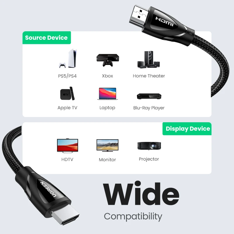 สาย2.1 HDMI ugreen 8K/60Hz 4K/120Hz แยก HDMI 48 Gbps ความเร็วสูงพิเศษสาย HDMI ไนลอนแบบถักสำหรับคอมพิวเตอร์ทีวี