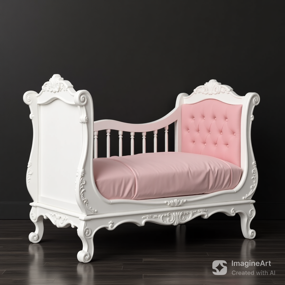 เตียงเด็กแกะสลักสีขาวทำด้วยกำมะหยี่สีชมพูหรูหราผลิตจากสหราชอาณาจักร