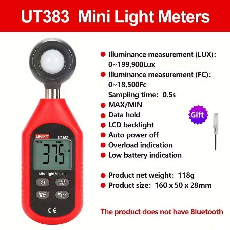 UNI-T UT383 เครื่องวัดความสว่างแบบดิจิตอลเกรดอุตสาหกรรม 199,900 เครื่องทดสอบความสว่างสำหรับการวัดแสงที่แม่นยำ UT383BT พร้อมบลูทูธ