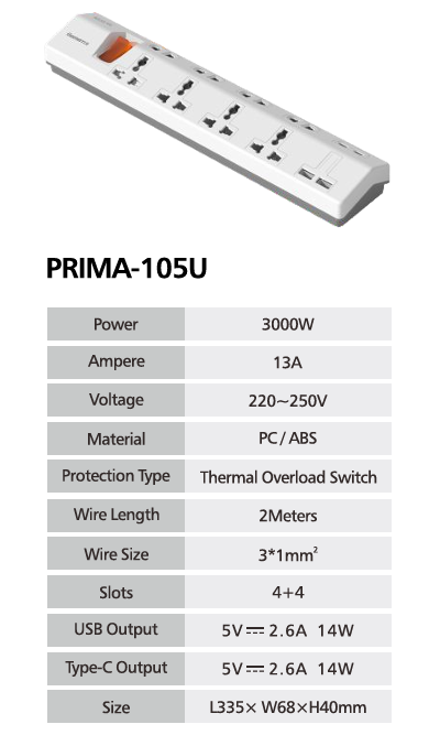 ปลั๊กพ่วงอเนกประสงค์ รุ่น PRIMA series 2 ดีไซน์โดดเด่น พร้อมพอร์ต USB A 2 ช่อง และพอร์ต USB C 2 ช่อง พร้อมสวิตช์ป้องกันไฟเกิน รองรับปลั๊กไฟแบบ UK/EU สำหรับใช้ในบ้าน