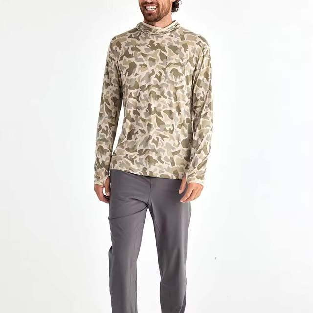 เสื้อมีฮู้ด UV สำหรับตกปลา UPF 50น้ำหนักเบาระบายอากาศได้ดีป้องกันแสงแดดสำหรับผู้ชายเสื้อตกปลา100% ผ้าฝ้ายลายพรางมีฮู้ด