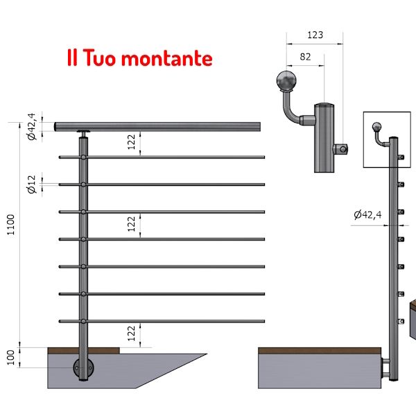 ราวจับแบบตั้ง7คานตัวยึดความสูงด้านข้าง42.4มม. ทำจากสเตนเลสซาติน P110132-7X