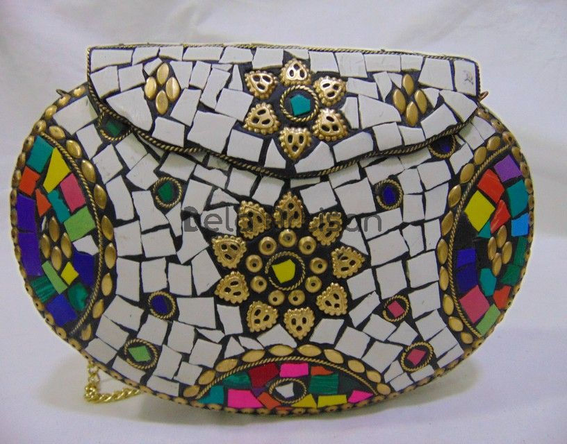 Handmade Mosaic Clutch Bag Boho Stone Inlay Purse with Brass Chain