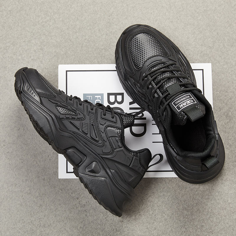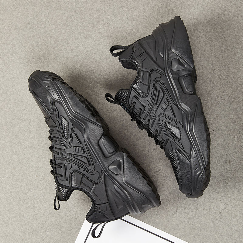 รองเท้าผ้าใบผู้ชายสีดำล้วน สไตล์สตรีทแวร์ลำลอง ระบายอากาศได้ดี ผลิตจากหนังสังเคราะห์ พื้นรองเท้า EVA นุ่มสบาย ทนทาน เหมาะสำหรับเล่นกีฬา ราคา 13 ดอลลาร์สหรัฐฯ คิดเป็น 47 ยูโร