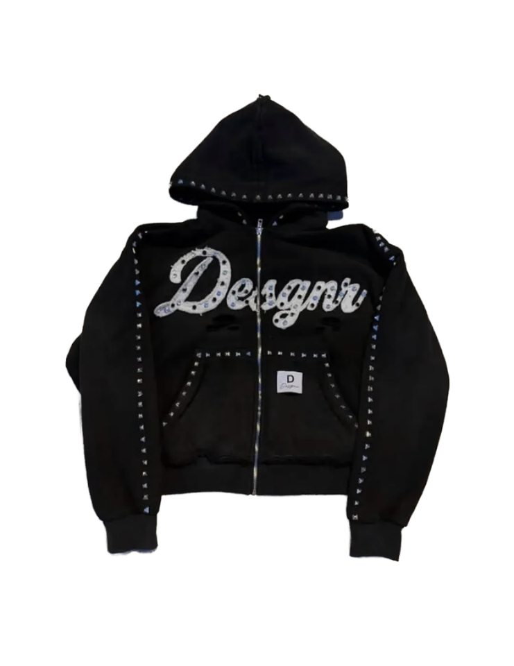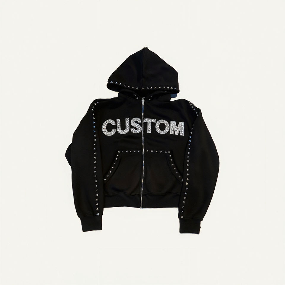 เสื้อผ้าสตรีทแวร์วินเทจผ้าฝ้ายแท้ 100% ไม่มีภาษีในสหรัฐอเมริกา ซิปแบบเฟรนช์เทอร์รี่เนื้อหนา ล้างสีแบบแอซิด ประดับคริสตัล ปักลายแบบซันเฟด