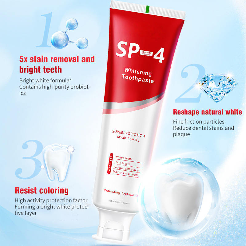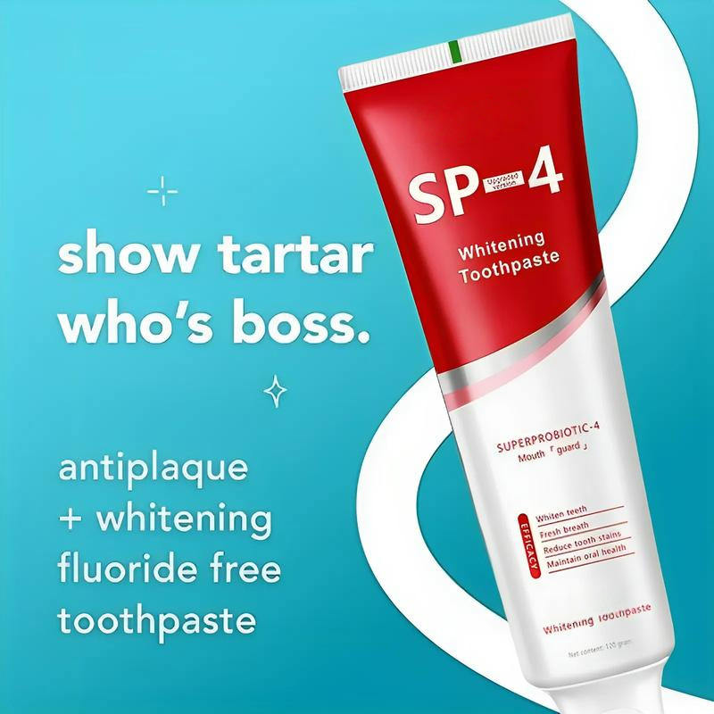 ยาสีฟันสมุนไพร SP-4 สูตรไวท์เทนนิ่งเพื่อฟันขาวกระจ่างใส ด้วยส่วนผสมของโปรไบโอติก ช่วยทำความสะอาดอย่างล้ำลึก ขจัดคราบกาแฟ ชา และคราบบุหรี่ 120 กรัม