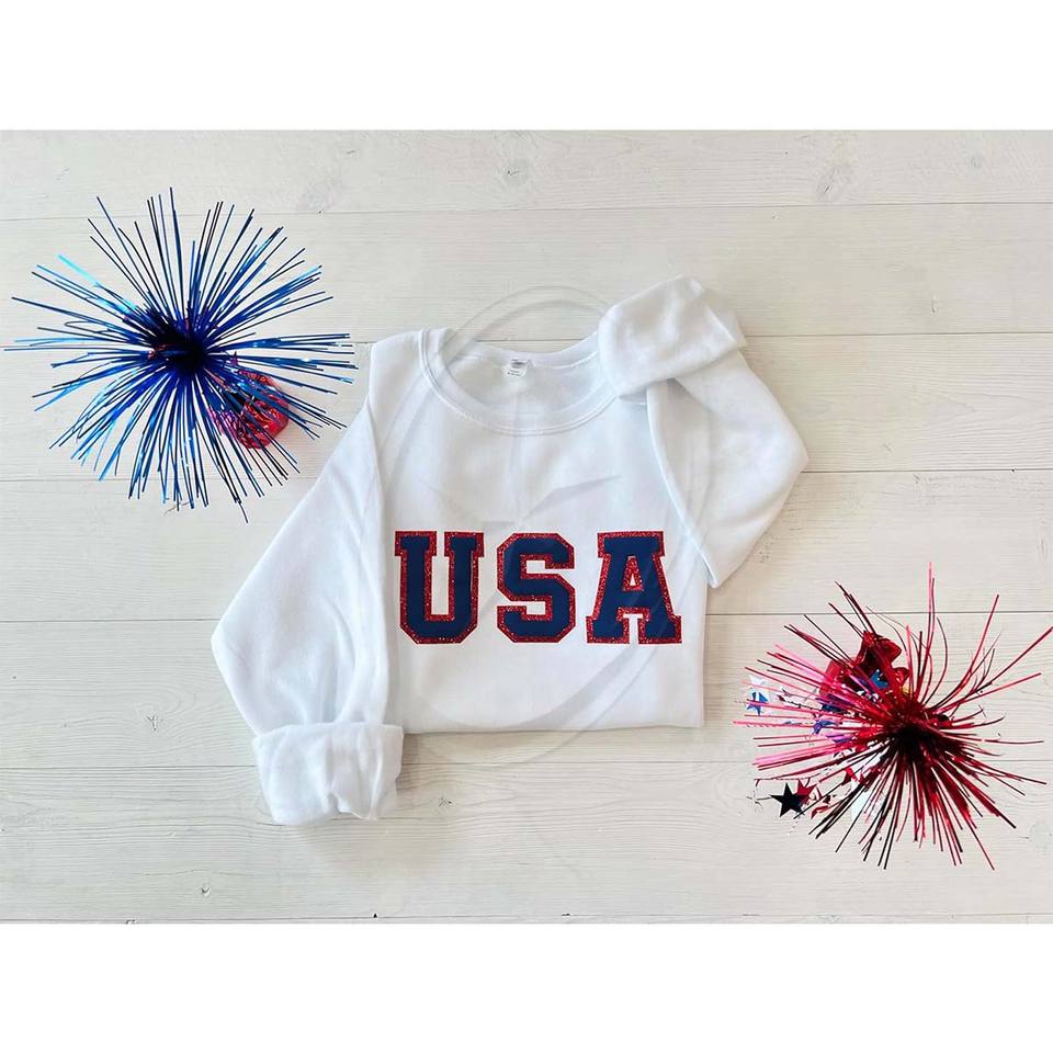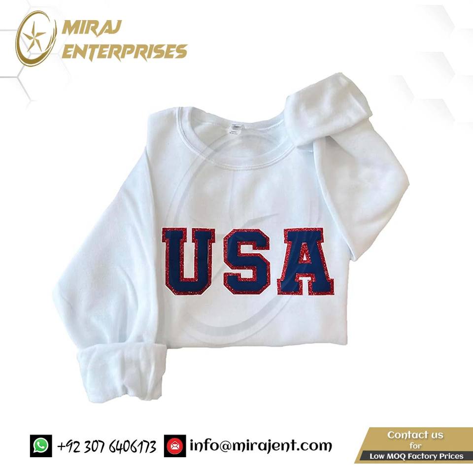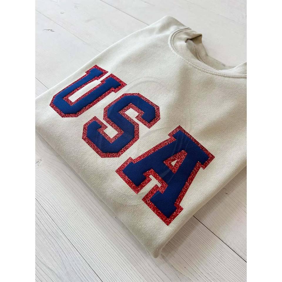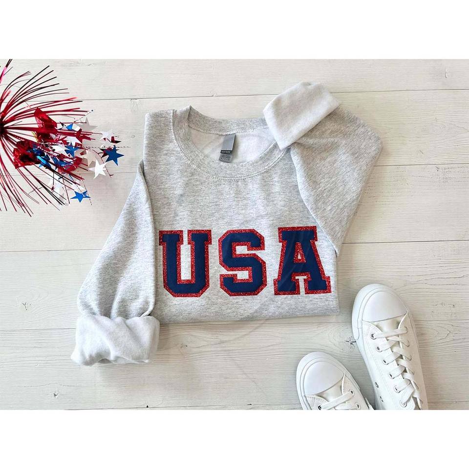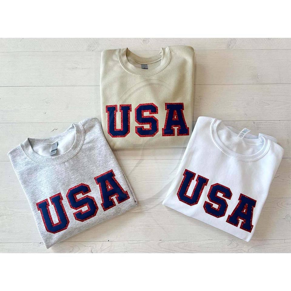 เสื้อสเวตเตอร์ลายนูนมีประกายจากสหรัฐอเมริกาเสื้อสเวตเตอร์คอกลมสำหรับวันเอกราชชุดสเวตเตอร์วันแห่งความทรงจำ