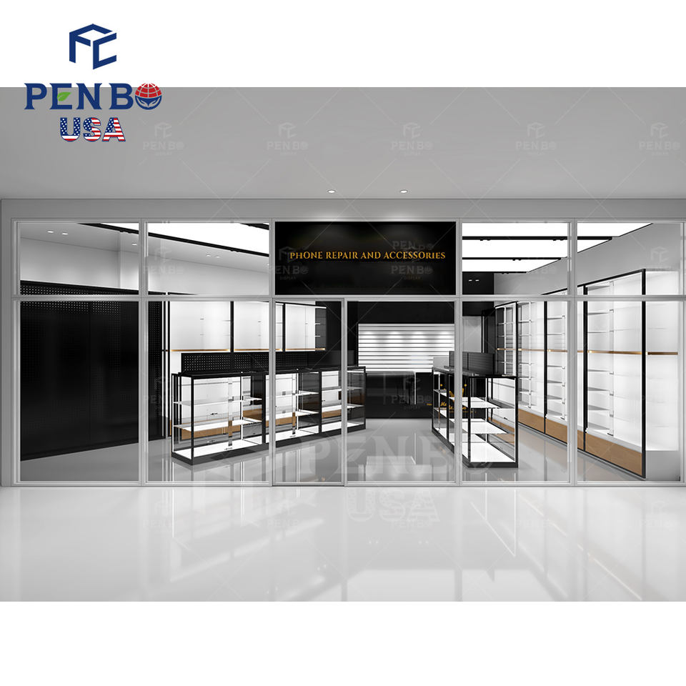 ตู้โชว์กระจกแบบมีไฟสำหรับโชว์โทรศัพท์มือถือดีไซน์เคาน์เตอร์ร้านโทรศัพท์มือถือตามสั่งในท้องถิ่นสหรัฐอเมริกา