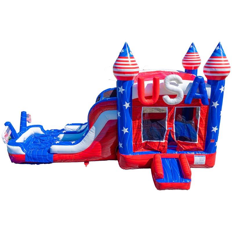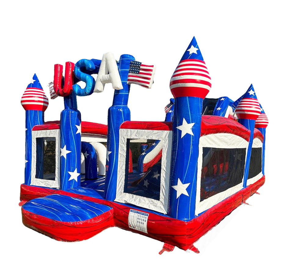 บ้านลมเป่าลมรูปธงชาติอเมริกา USA ShapeShifter พร้อมเครื่องเล่นเป่าลมรูปธงชาติอเมริกาแบบดั้งเดิม สนามกีฬาเป่าลมลายธงชาติอเมริกา