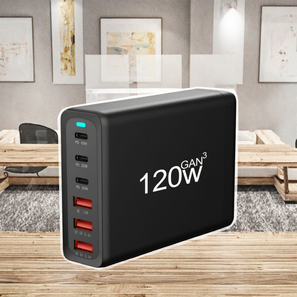 USB C 120W ที่ชาร์จพอร์ต6 PD 65W GAN สถานีชาร์จโทรศัพท์อย่างรวดเร็วสำหรับ iPhone iPad แท็บเล็ตแล็ปท็อป QC3.0ที่ชาร์จติดผนัง