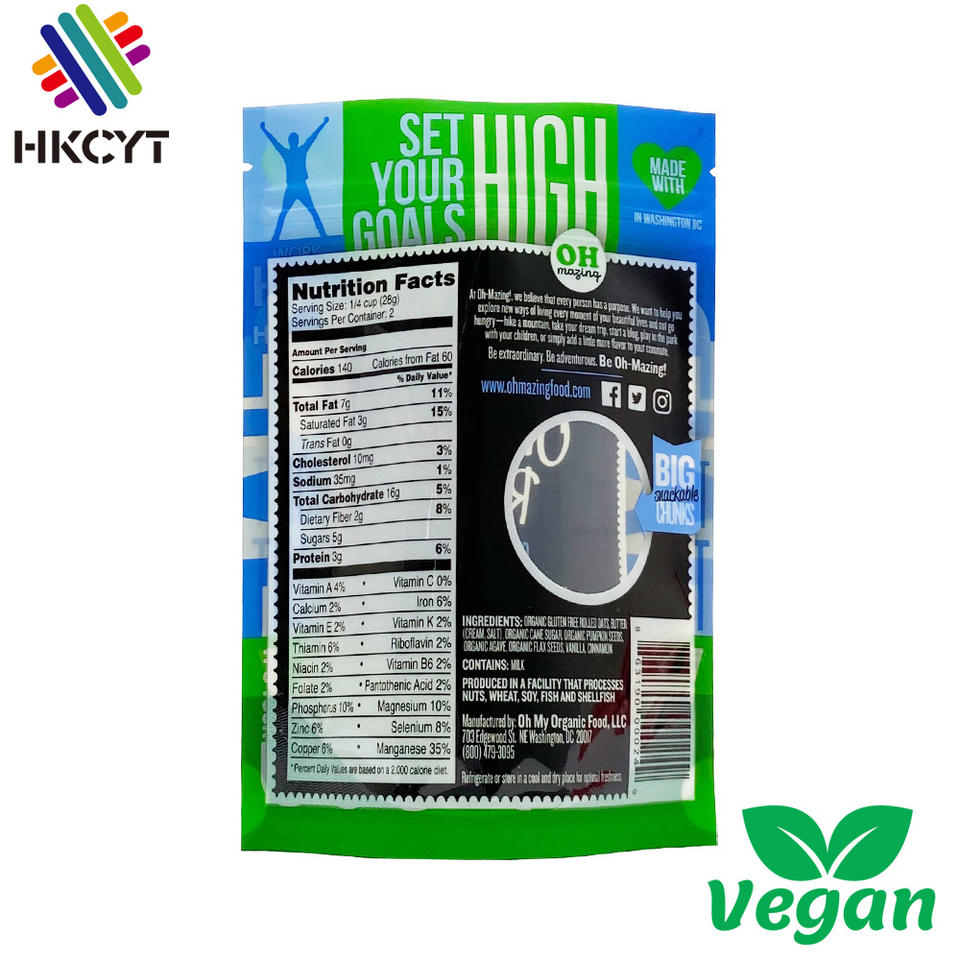 UV พิมพ์ที่กำหนดเองการออกแบบนำมาใช้ใหม่ซิปพลาสติกวีแกนธัญพืชยืนขึ้นถุง Ziplock