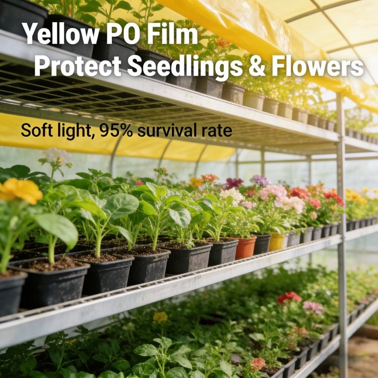 ฟิล์มคลุมโรงเรือนสีเหลือง PO ทนรังสียูวี ป้องกันความร้อน ได้รับการรับรองมาตรฐาน CE ป้องกันหยดน้ำ ป้องกันฝุ่น สำหรับสวนดอกไม้ ต้นกล้า และผัก