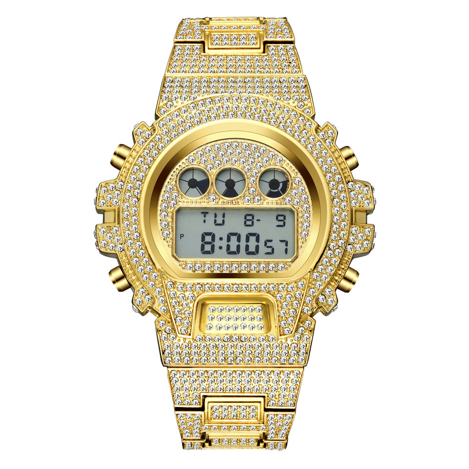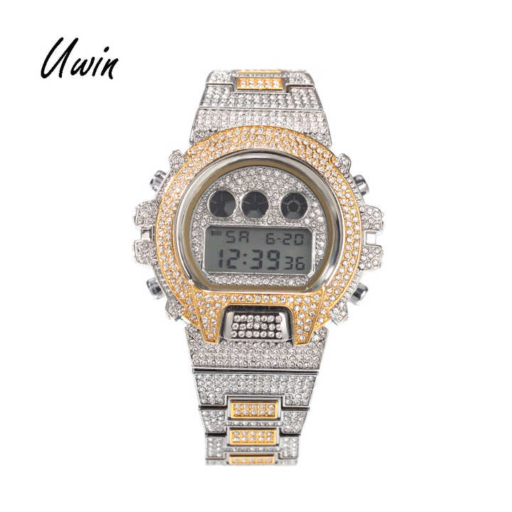 นาฬิกาข้อมือดิจิตอลหรูหราสำหรับผู้ชาย UWIN ประดับเพชร CZ เต็มเรือน นาฬิกาข้อมือสไตล์แร็ปเปอร์