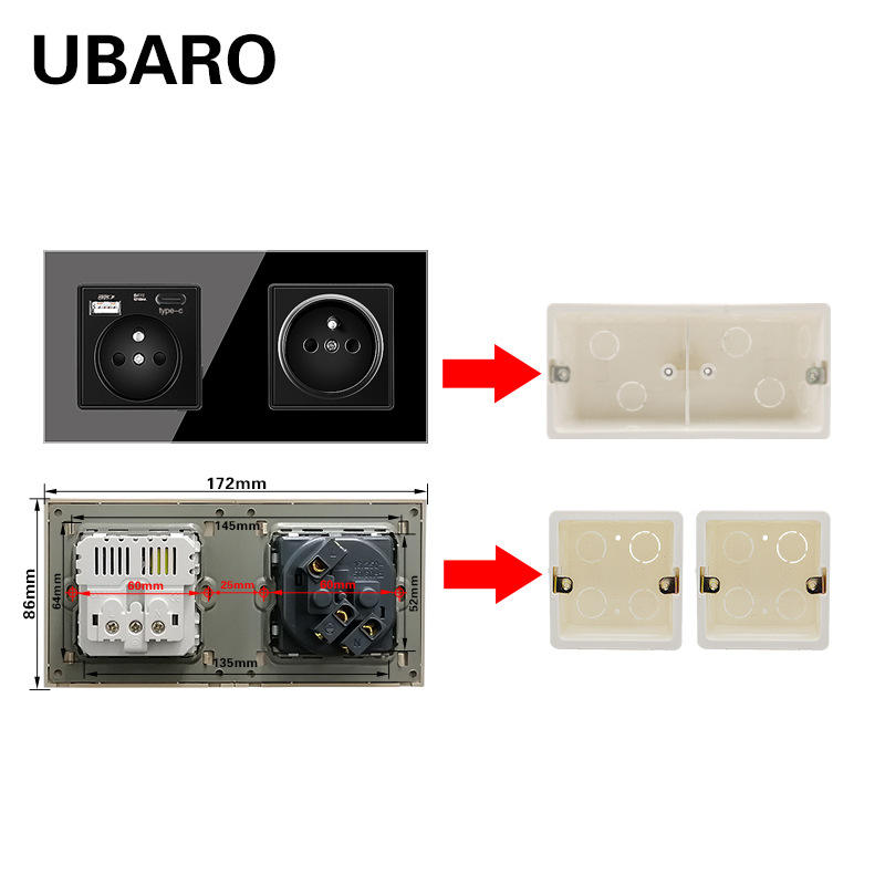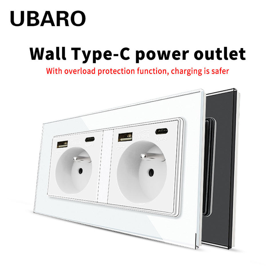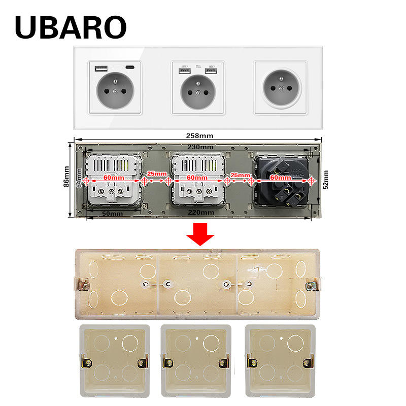 ยูบาโร่ ปลั๊กไฟติดผนังสไตล์ฝรั่งเศส 16A แผงกระจกนิรภัย ติดตั้งแบบกล่องสี่เหลี่ยมพร้อมประตูป้องกัน