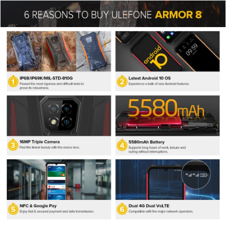 Ulefone Armor 8 Android 10 Rugged MobilePhone 4G NFC Helio P60 4GB+64GB Phone Octa-core 2.4G/5G WiFi 6.1'' Waterproof Smartphone