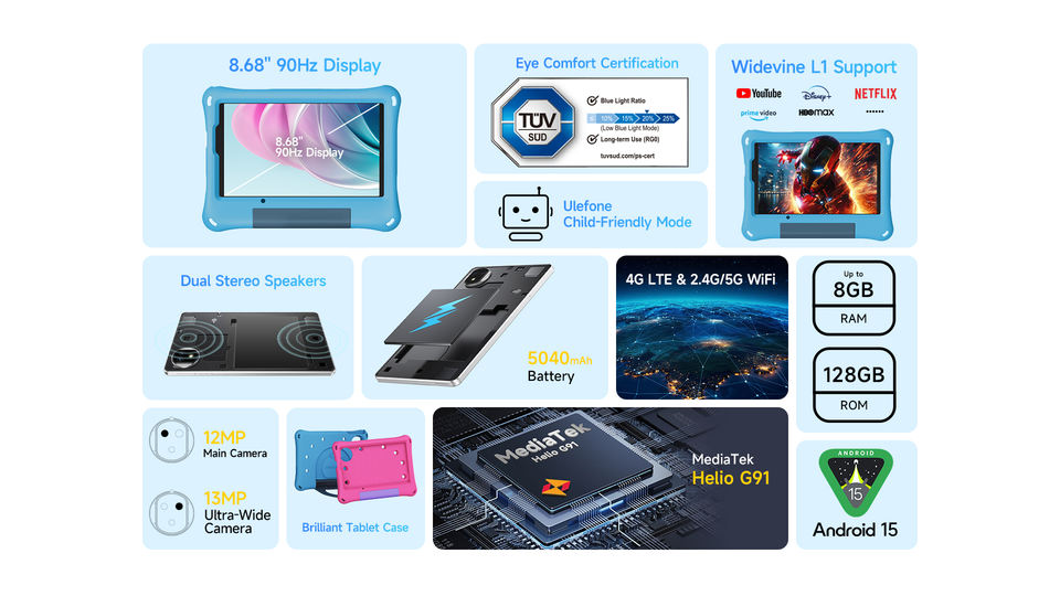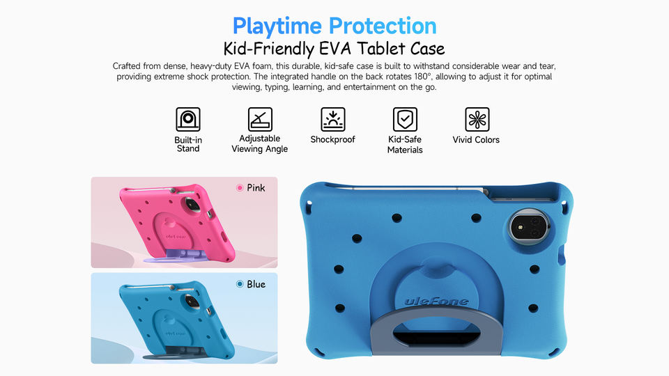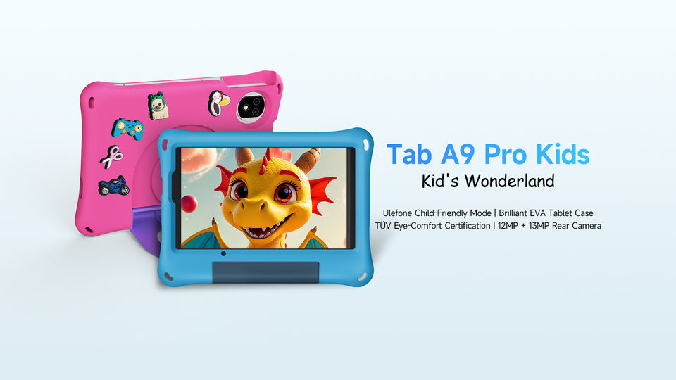 แท็บเล็ต Ulefone Tab A9 Pro สำหรับเด็ก เน้นการศึกษา รองรับ 4G ทนทานสำหรับกิจกรรมกลางแจ้ง หน่วยความจำ 4+128GB กล้อง 12MP ปกป้องสายตา ระบบปฏิบัติการ Android 15 สีชมพู/ฟ้า พร้อมใช้งานกลางแจ้ง