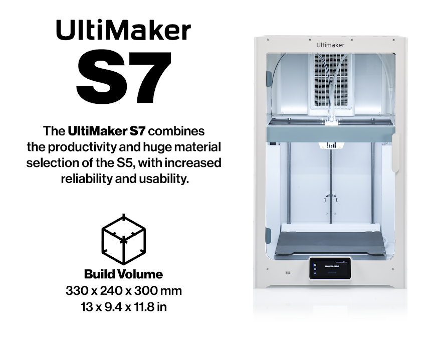 เครื่องพิมพ์สามมิติ UltiMaker S7 พร้อมแผ่นทำความร้อนแบบยืดหยุ่น PEI ระบบหัวฉีดคู่ โครงสร้างปิดมิดชิด ปรับระดับอัตโนมัติ ใช้เทคโนโลยี FDM สำหรับวัสดุหลากหลายประเภท