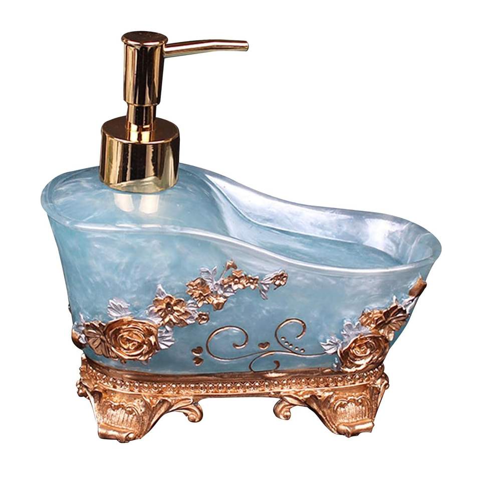 ที่ใส่สบู่เหลวทำจากเรซินสีน้ำเงินและโลชั่นปั๊มสำหรับห้องน้ำห้องน้ำของใช้บนโต๊ะชิ้นเดียวดีไซน์ที่ดีที่สุด
