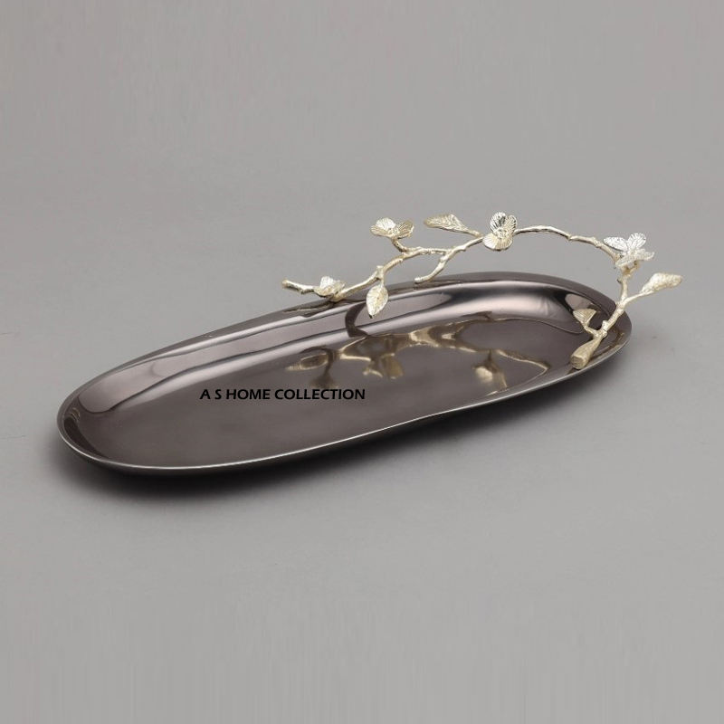 ถาดเสิร์ฟขนมรูปวงรีเคลือบเงาอย่างดี ถาดเสิร์ฟผลไม้อบแห้งโลหะ ถาดสแตนเลสดีไซน์ใบไม้
