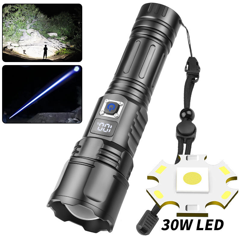 ไฟฉายโฟกัสสว่างพิเศษ 30W ไฟ LED สีขาว จอแสดงผลดิจิตอล ชาร์จซ้ำได้ ชนิด Type C ระยะไกล สำหรับใช้งานกลางแจ้ง