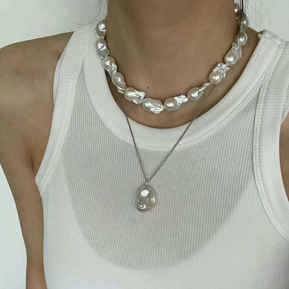 สร้อยคอมุกบาโรกสุดคุ้ม ดีไซน์หางปลาเม็ดใหญ่ สร้อยคอแฟชั่นแบบซ้อนชั้นสุดอลังการ