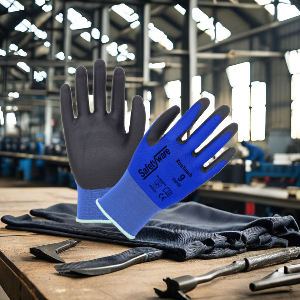 ถุงมือนิรภัยกันลื่นแบบอัลตร้าโฟมไนไตรล์ป้องกันการตัดวัสดุไนลอนสแปนเด็กซ์อุตสาหกรรมสำหรับหน้าจอสัมผัสที่ใช้ได้