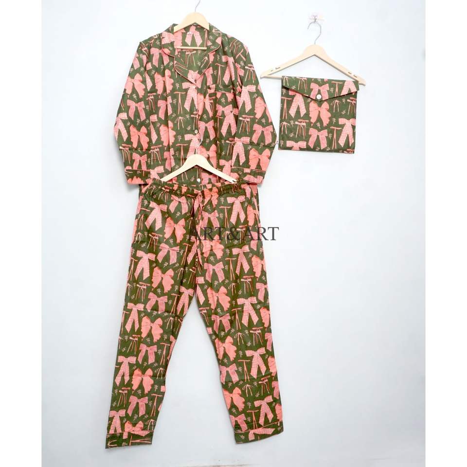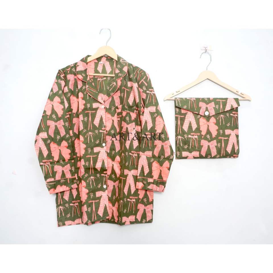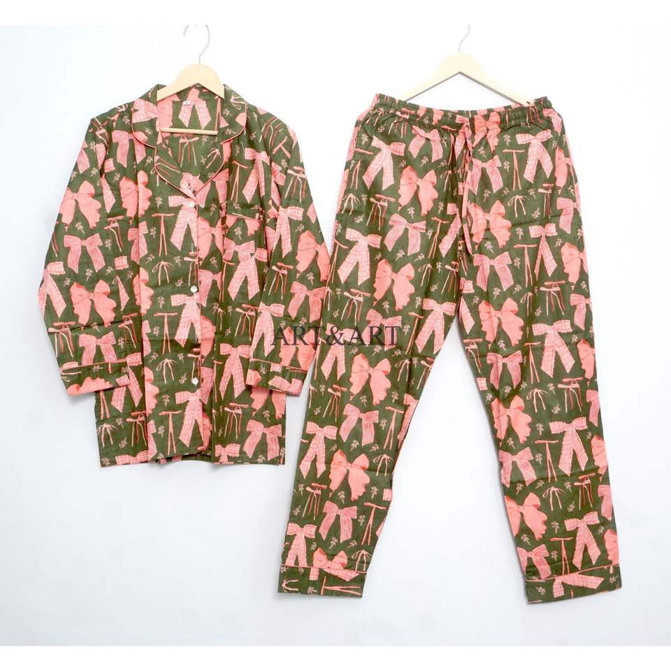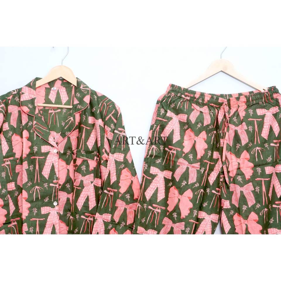 ชุดนอนผ้าฝ้ายอินเดียแท้พิมพ์ลายโบว์ คอวี แขนยาว สไตล์โรแมนติก น้ำหนักเบา สำหรับผู้หญิง เหมาะสำหรับใส่ตอนเช้า
