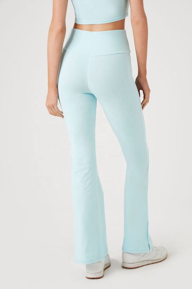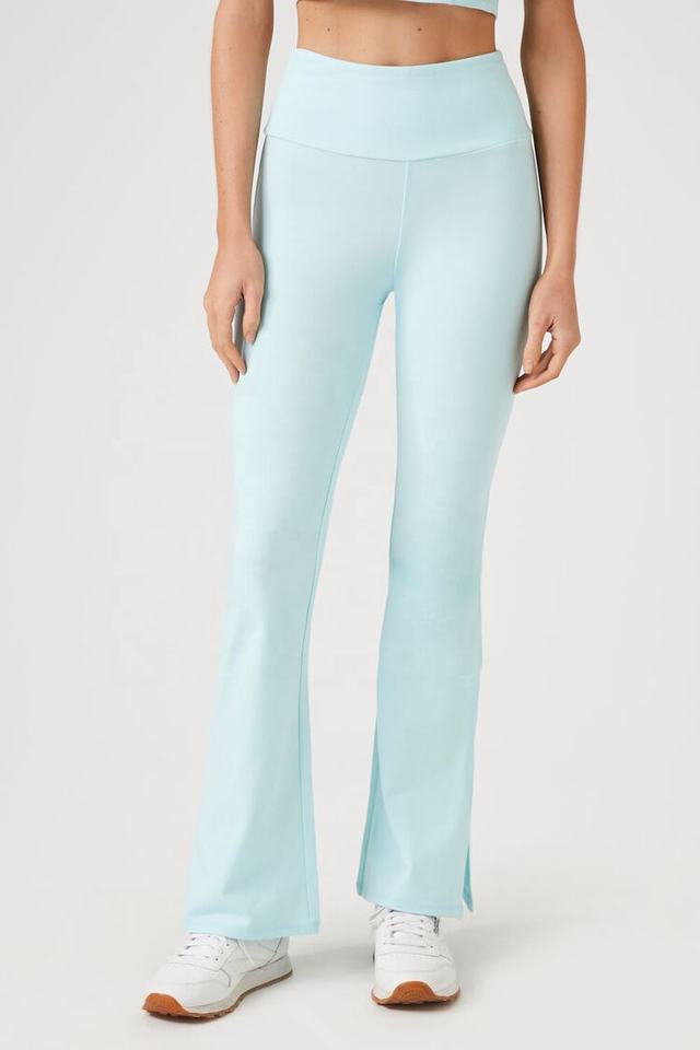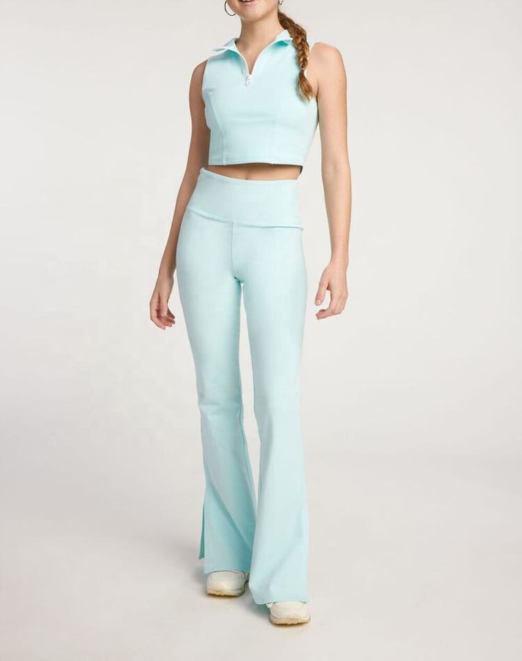 ชุดโยคะสองชิ้นสีน้ำเงินอ่อนของผู้หญิงเสื้อแขนกุดเอวสูงกางเกงบานพิมพ์ลายยืดได้สี่ทางเป็นมิตรกับสิ่งแวดล้อมระบายอากาศ