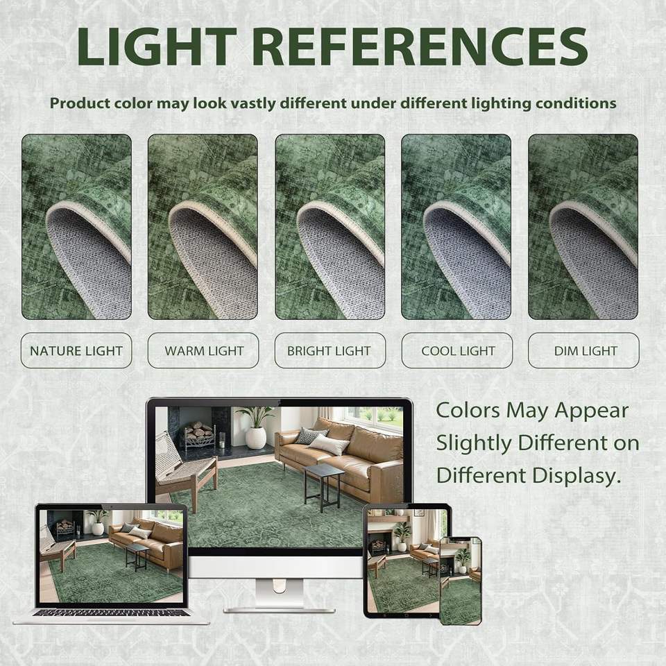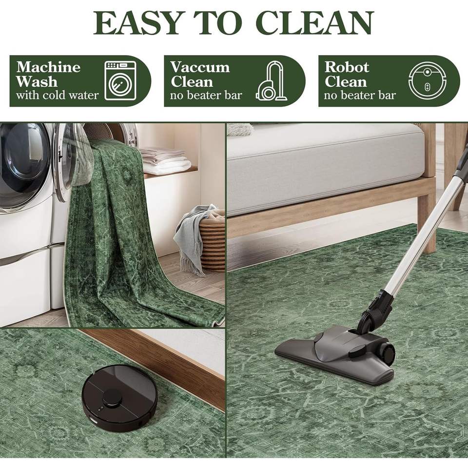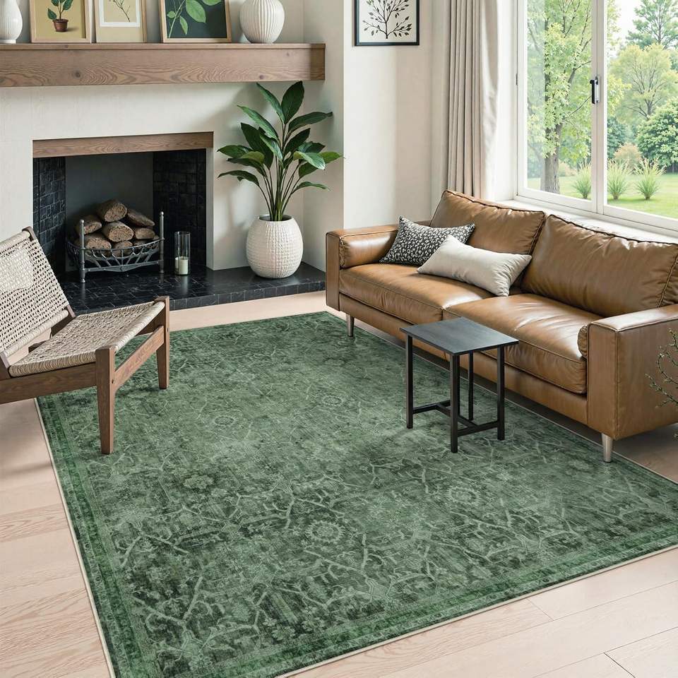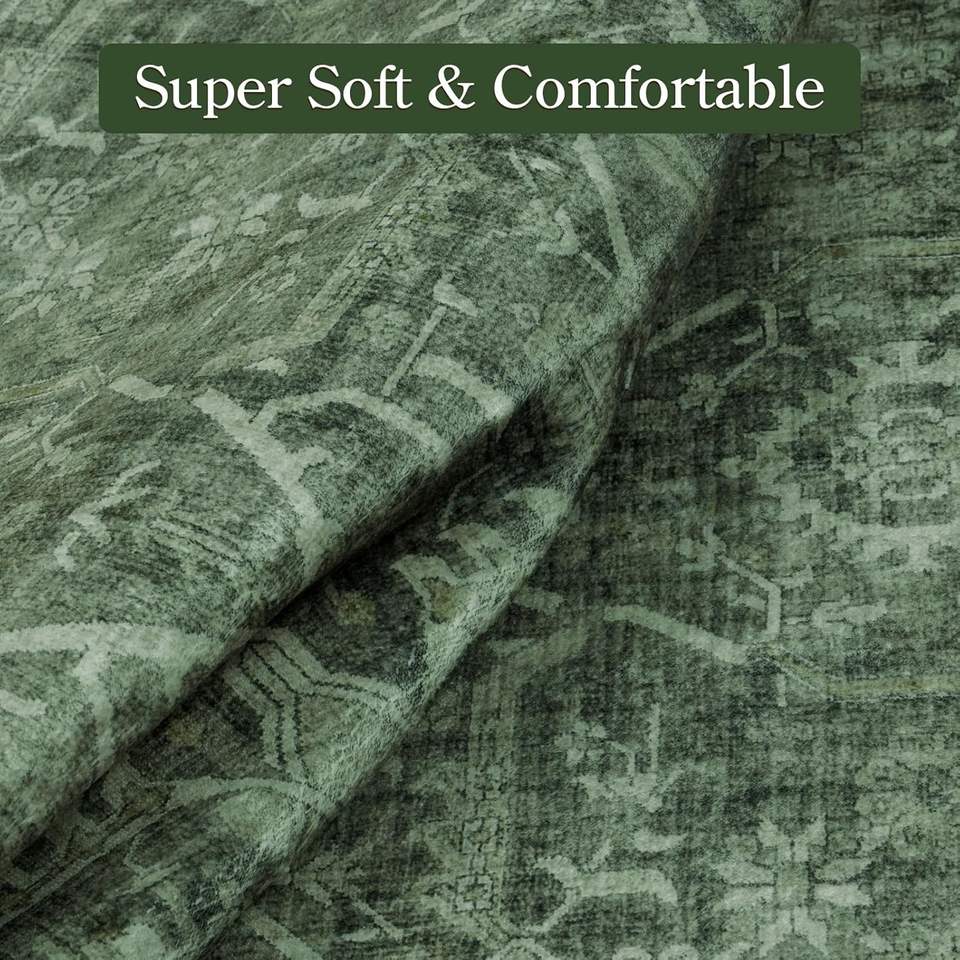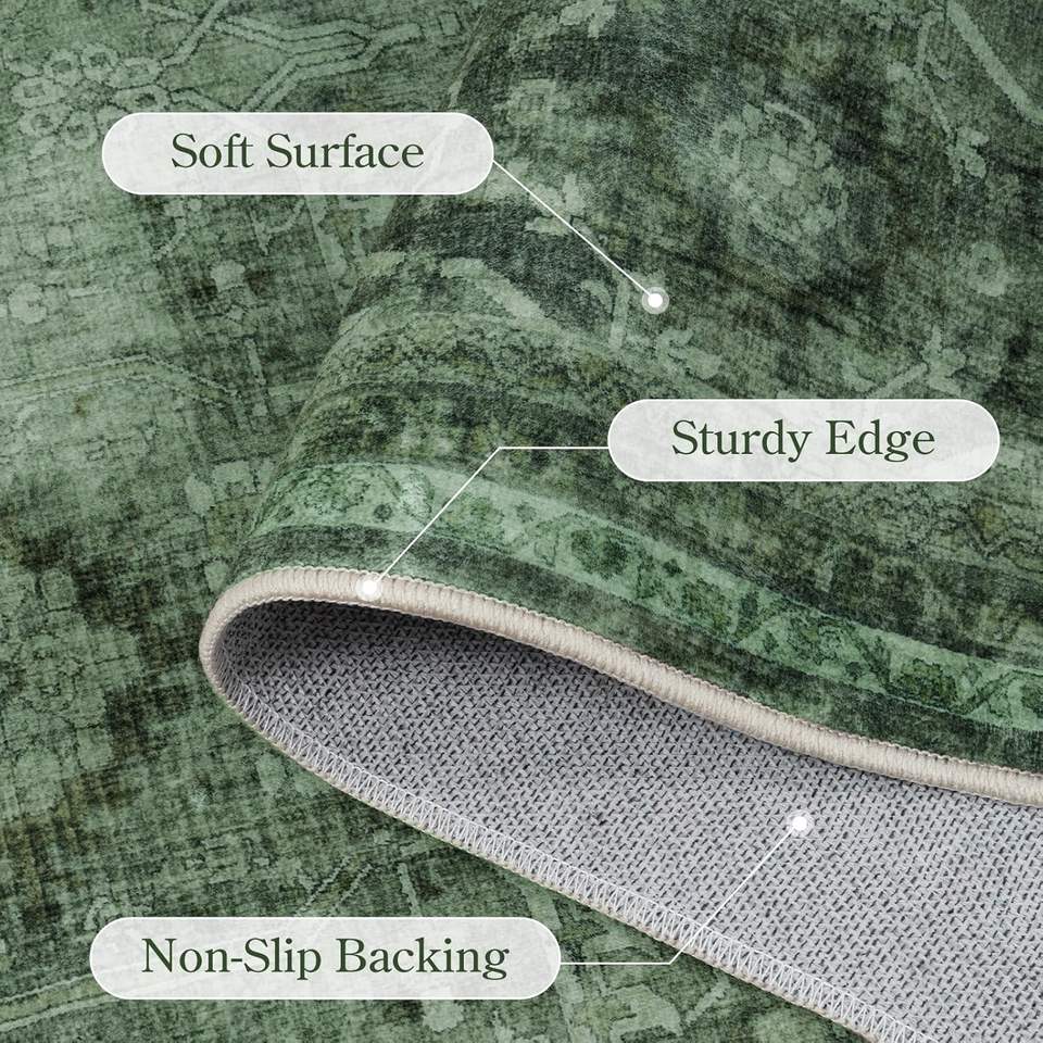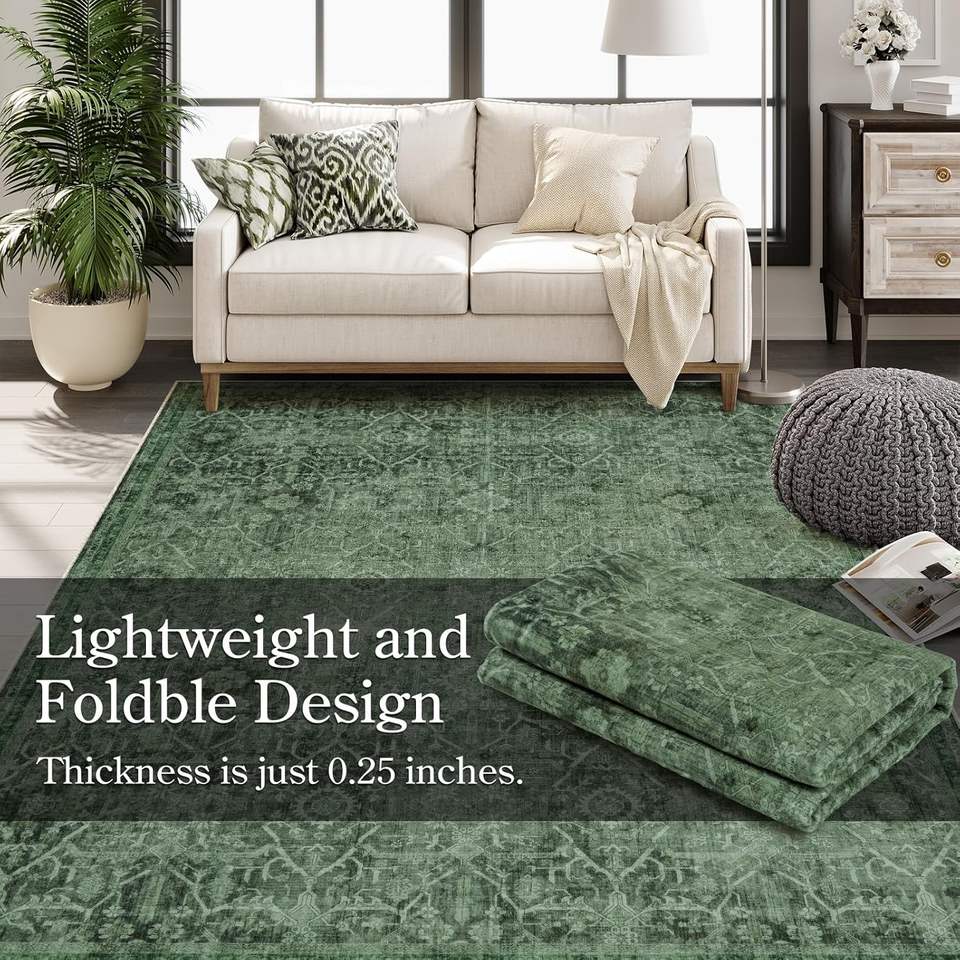Ultra-Thin 5x7 Large Vintage Dark Green Polyester Low Pile Area Rug Non-Slip Stain Resistant Living Room Dining Room Office