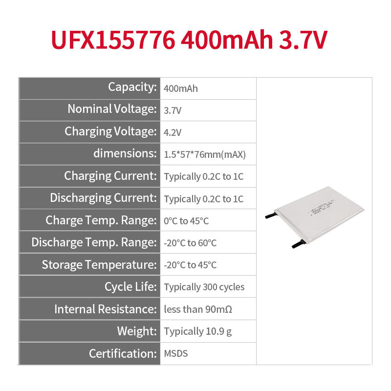 แบตเตอรี่โซลิดสเตตแบบบางพิเศษชนิด Pouch Cell ขนาดเล็ก 3.7V 400mAh 015776 800 รอบการใช้งาน แคโทด LiCoO2 Ufine