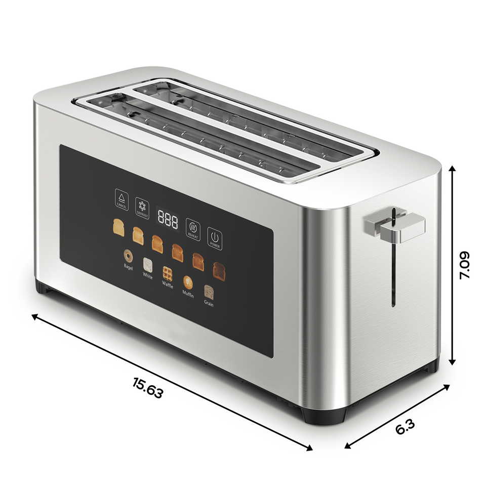 เครื่องปิ้งขนมปังอัลตร้าไวด์ 4 ช่อง ควบคุมแบบคู่ สีเงิน หน้าจอสัมผัส LED ขนาด 1.5 นิ้ว พร้อมคุณสมบัติพิเศษ 4 ช่องสำหรับปิ้งขนมปัง