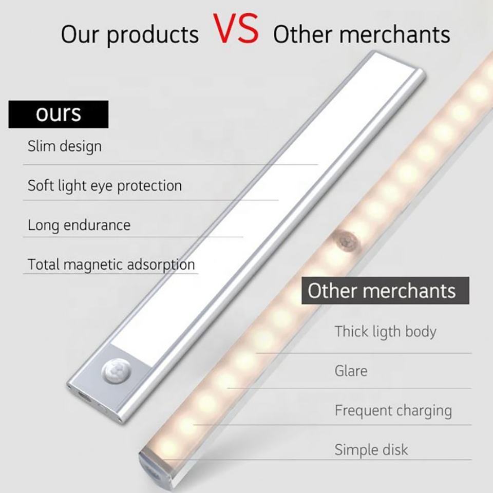 ไฟ LED ใต้ตู้แบบชาร์จ USB พร้อมเซ็นเซอร์ตรวจจับความเคลื่อนไหว PIR ขนาดบางพิเศษ 20 ซม. 30 ซม. 40 ซม.