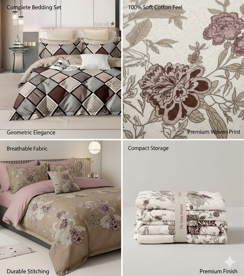 ผ้าปูที่นอนแบบเรียบ 1 ผืน + ผ้าปูที่นอนแบบรัดมุม 1 ผืน + ปลอกหมอน 2 ใบ