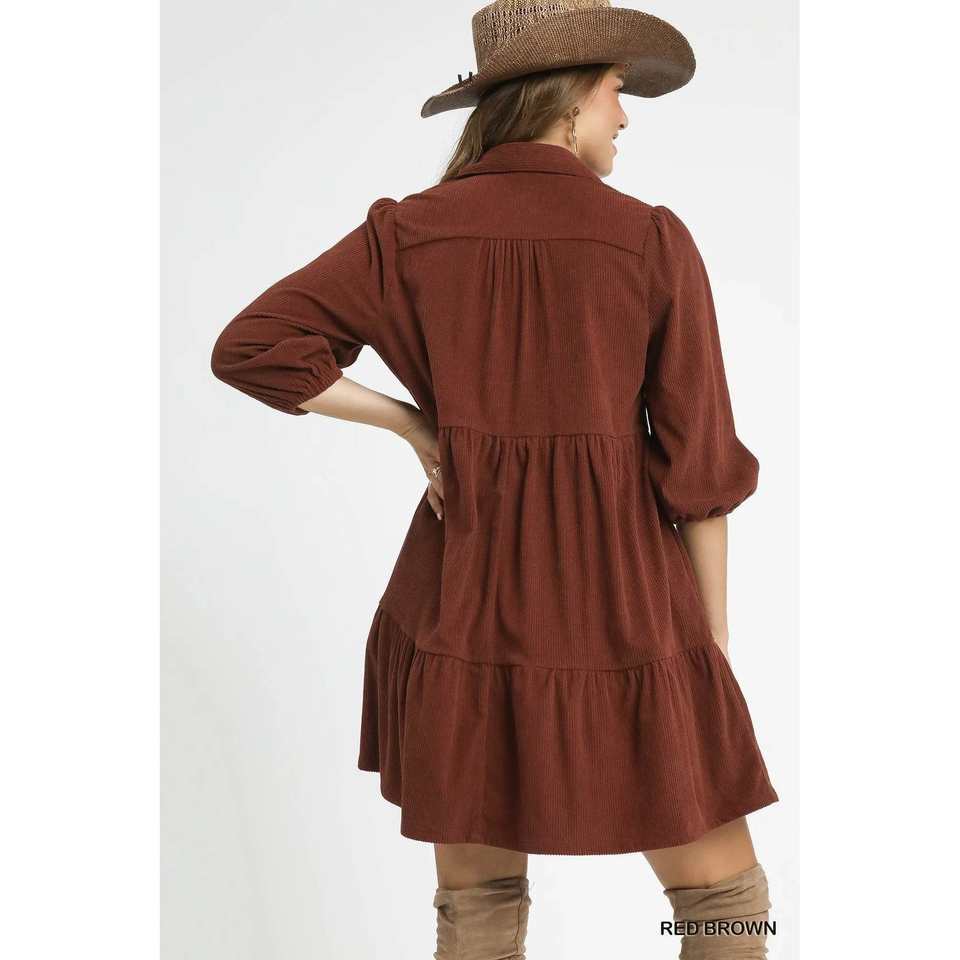 มินิเดรสผ้าลูกฟูกแบบมีระดับของอุมเก้ แขนทรงบอลลูน สีแดงน้ำตาล ไซส์ S รุ่นแฮนด์ฟูลเฟิล