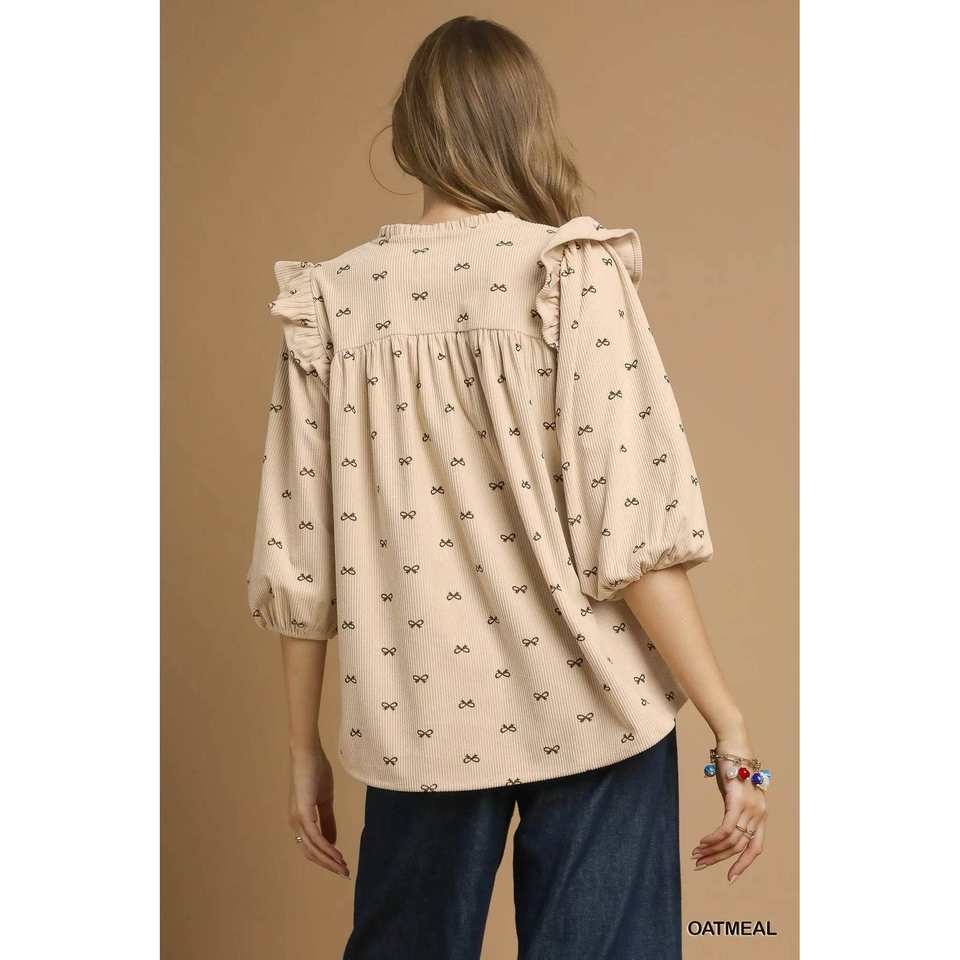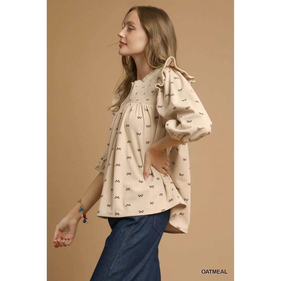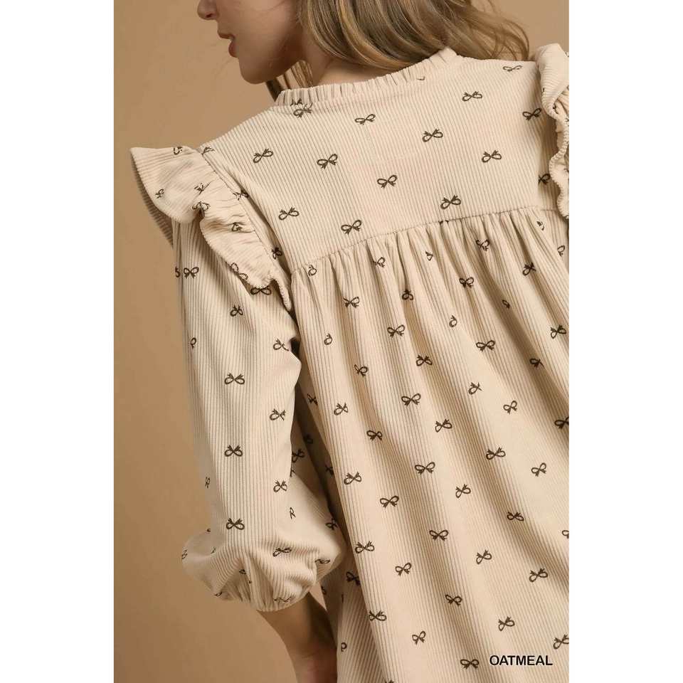 เสื้อโอ๊ตเมลสำหรับผู้หญิงของอุมเก้พร้อมแขนพองผ้าลูกฟูกพิมพ์ลายโบว์และดีเทลระบาย ไซส์ S