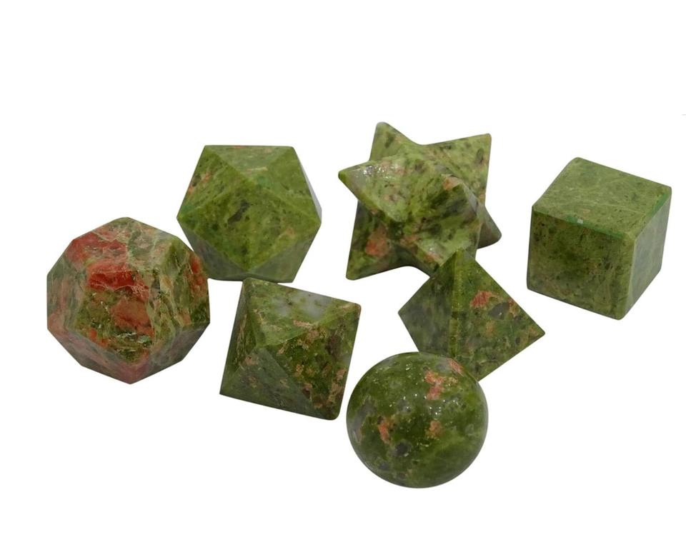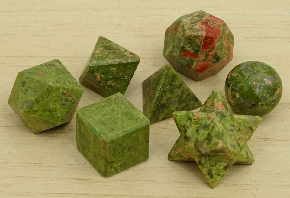 ชุดคริสตัลรูปทรงเรขาคณิต unakite แกะสลักหินธรรมชาติอันศักดิ์สิทธิ์สำหรับการรักษา platonic solids รูปทรงเรขาคณิตที่ไม่ซ้ำกัน