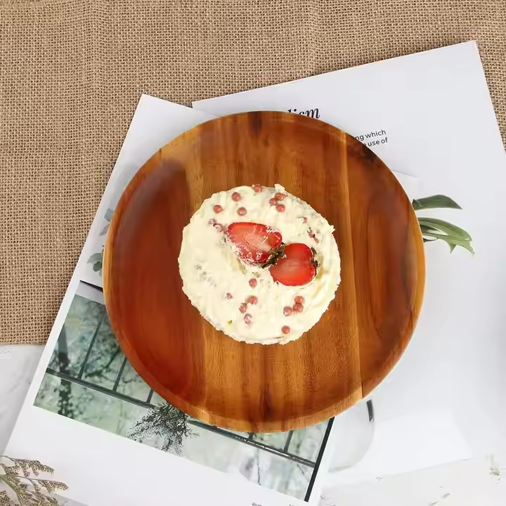จานคลาสสิกที่ไม่แตกหักจานไม้อะคาเซียจานมื้อเย็นจานกลมขนาด7.8นิ้วสำหรับจานด้วยงานฝีมือเสี้ยว