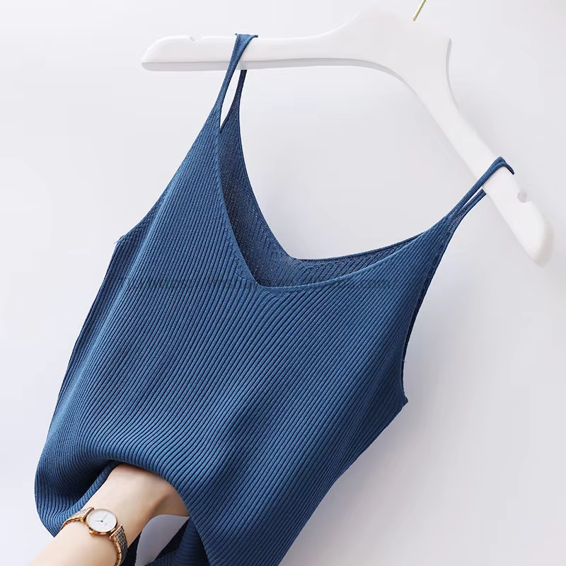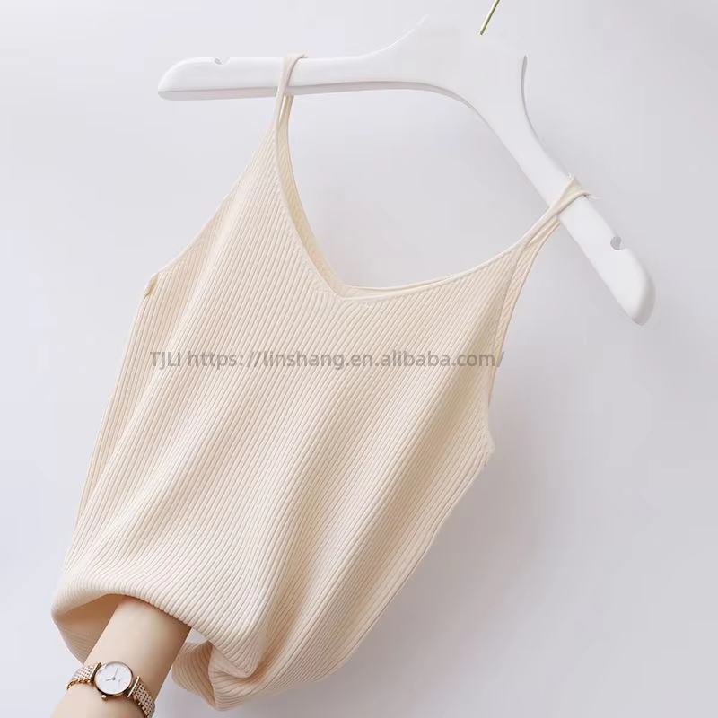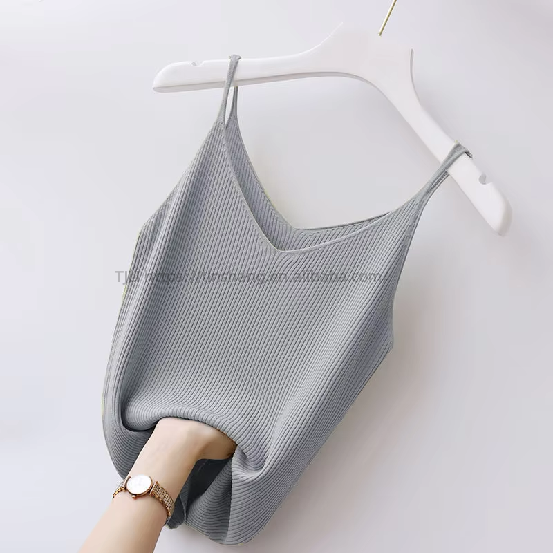 เสื้อกล้ามคอวีผ้าไอซ์ซิลค์เสื้อถักเกลียวสั้นเซ็กซี่สำหรับผู้หญิงเสื้อแฟชั่น