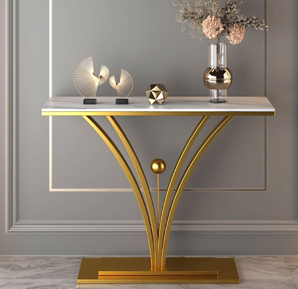 โต๊ะคอนโซลด้านบนหินอ่อนสีขาวที่ทันสมัยพร้อมดีไซน์ฐานโลหะสีทองแบบแอบสแตรกที่โดดเด่น