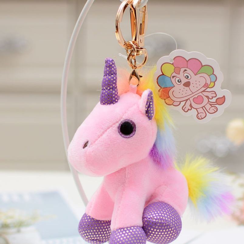 พวงกุญแจขนยูนิคอร์นขนสีรุ้งพวงกุญแจกระเป๋าขนลูกบอลพวงกุญแจยูนิคอร์น