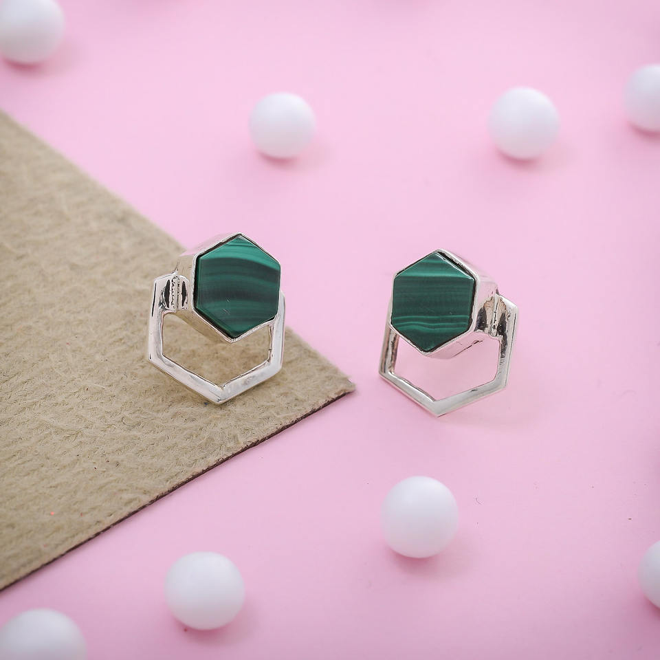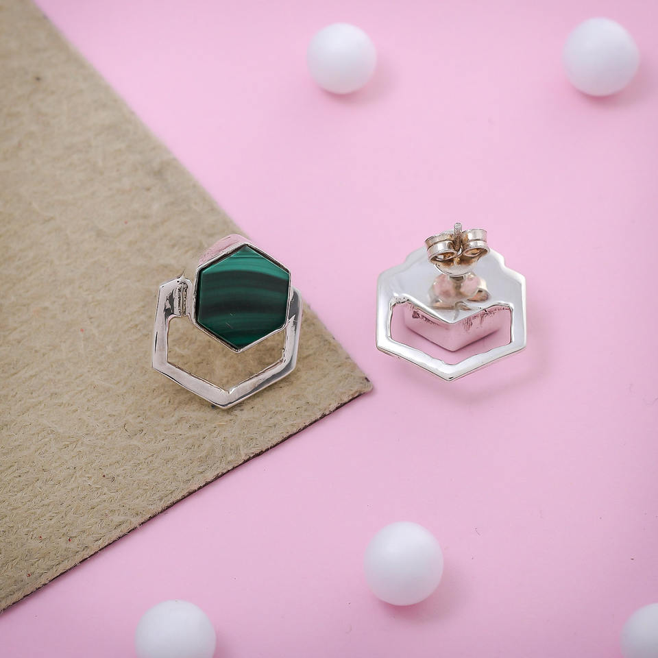 Unique 925 Sterling Silver Dainty Stud Earrings With Hexagon Shaped Malachite Jewelry Jewellery Wholesaler