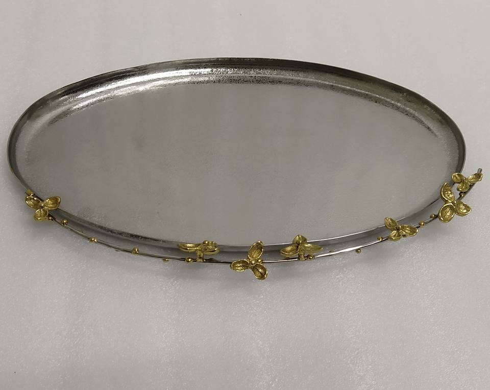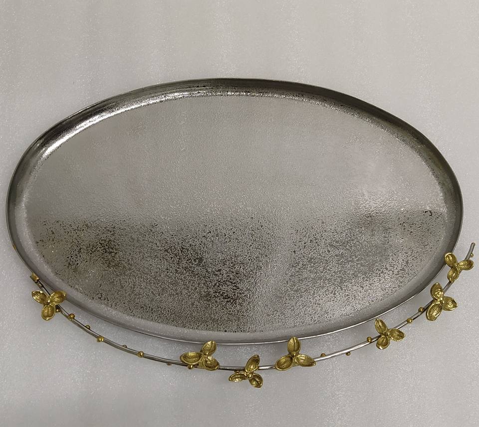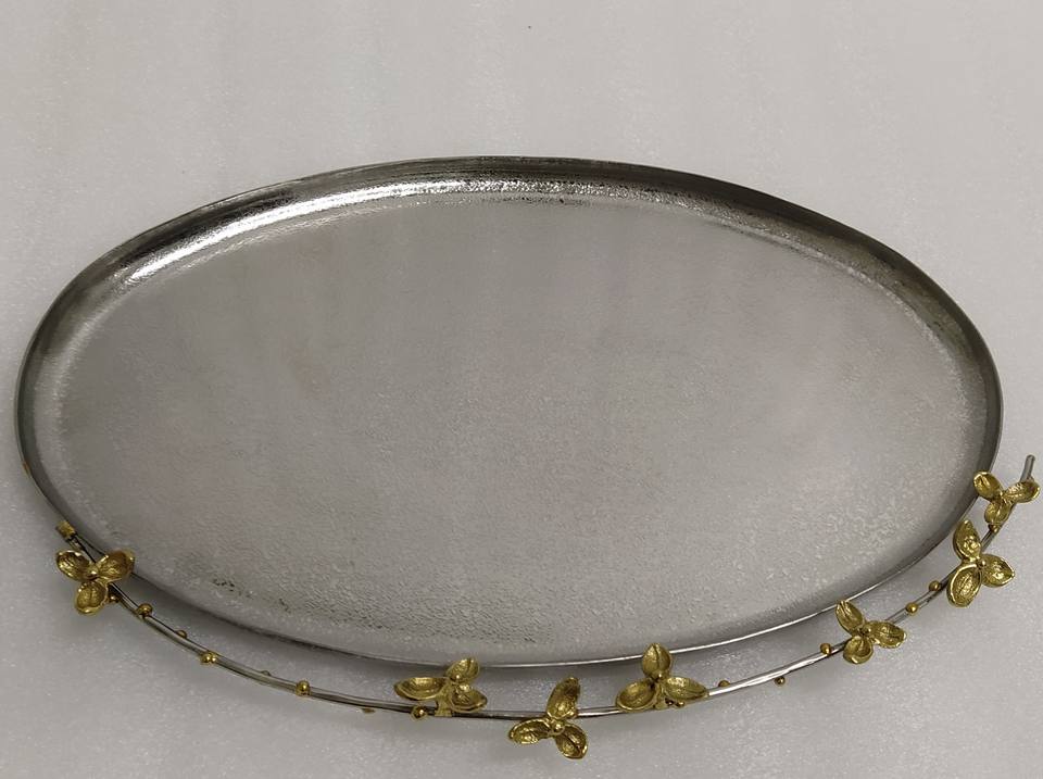 ถาดเสิร์ฟทองเหลืองและเหล็กที่ไม่ซ้ําใครสําหรับบ้านโรงแรมร้านอาหารอาหารเย็นและโต๊ะสีเงินออกแบบดอกไม้ถาดเสิร์ฟและจาน