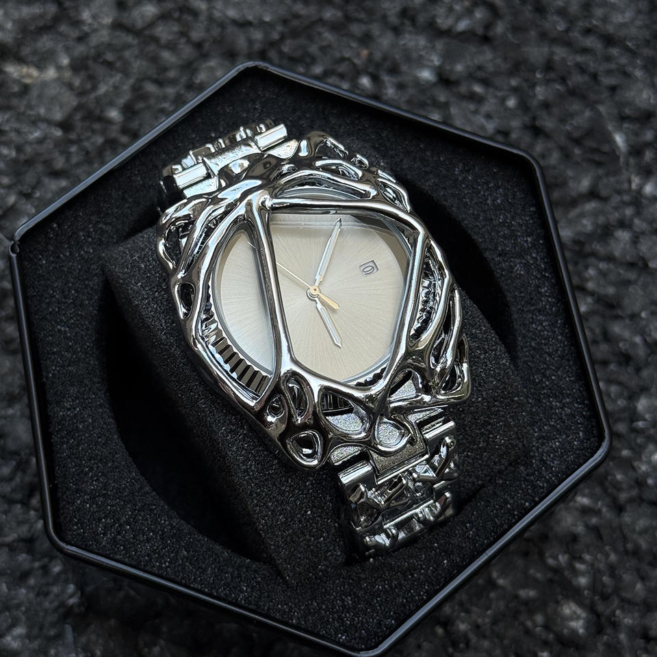 นาฬิกาข้อมือผู้ชายดีไซน์ใยแมงมุมบิดเกลียว รุ่น Unique Creative Vantage Alabaster แฟชั่นฮิปฮอป สายเหล็ก ควอตซ์ แสดงวันที่ แบบสั่งทำพิเศษ