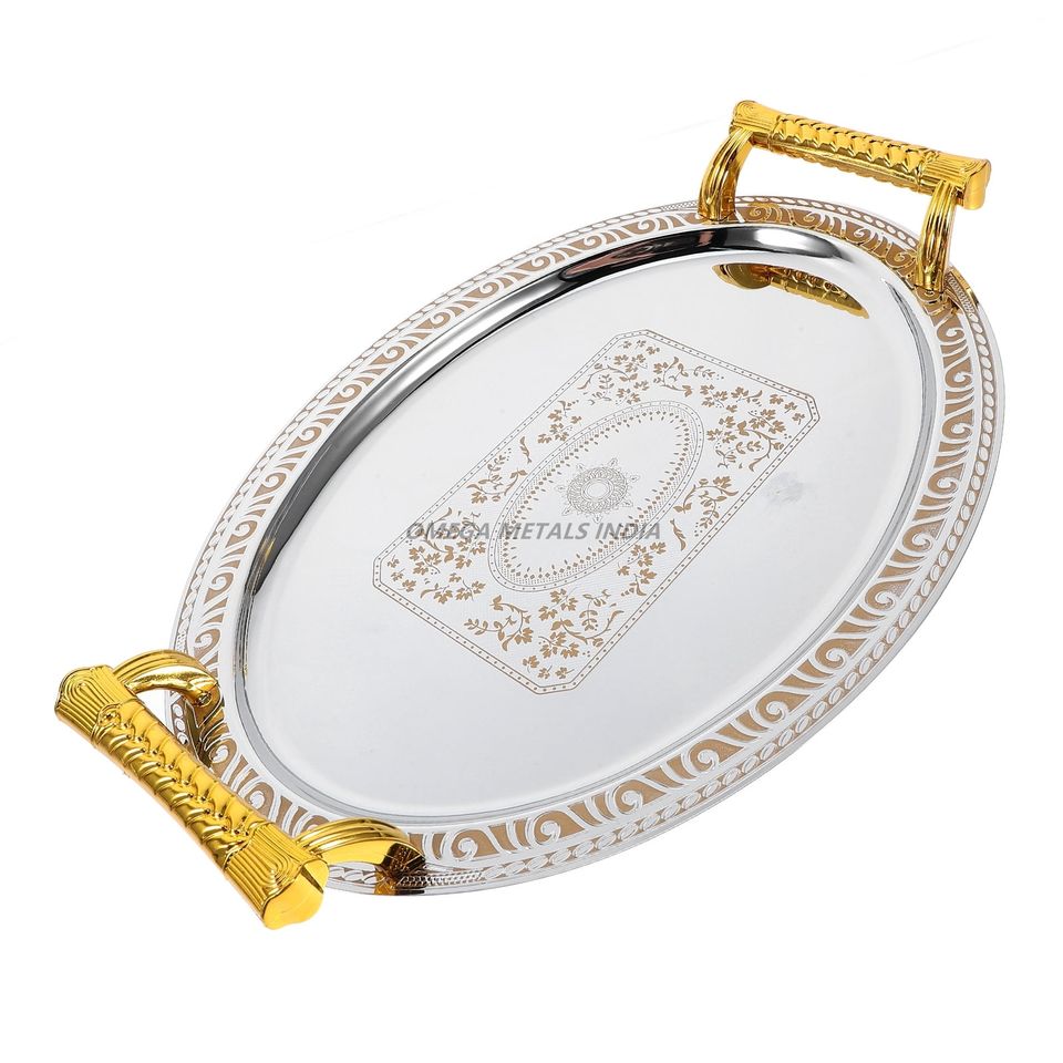 ถาดเสิร์ฟของตกแต่งที่ไม่เหมือนใครในรูปวงรีสีทองที่สวยงามพร้อมพื้นผิวเรียบเนียนเหมาะสำหรับการรับประทานอาหารและการจัดแสดงที่หรูหรา