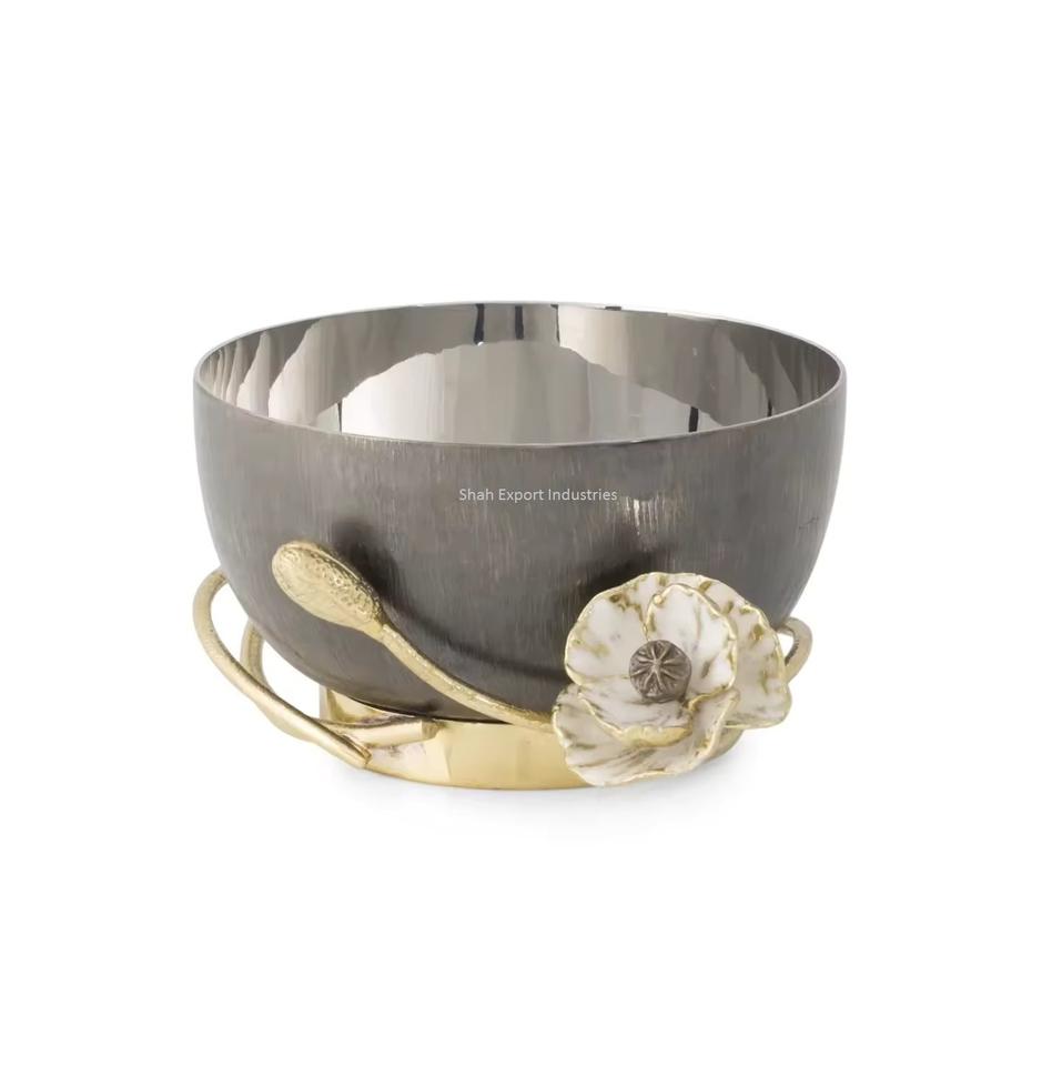 อุปกรณ์ทานอาหารเย็นทำจากโลหะชามอาหารสแตนเลสตกแต่งอย่างมีเอกลักษณ์พร้อมใบไม้สีทองสำหรับโรงแรมและร้านอาหาร