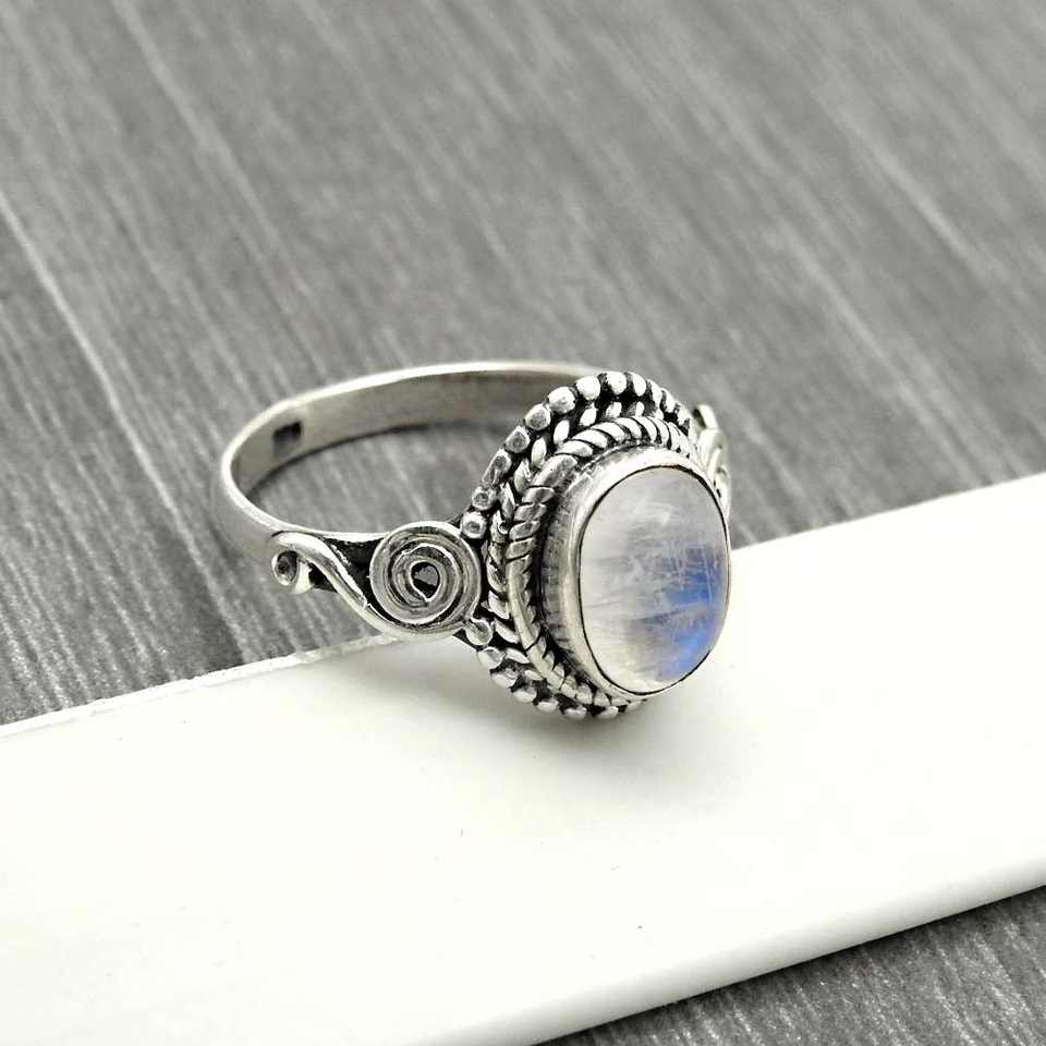 แหวนเงินแท้ 925 ดีไซน์เฉพาะตัว ประดับด้วยพลอยมูนสโตนสีรุ้งธรรมชาติ รูปทรงวงรี งานแฮนด์เมด สไตล์โบโฮ