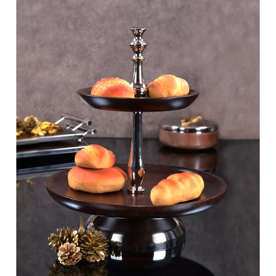 แท่นวางเค้กดีไซน์ไม่เหมือนใครทำด้วยมือไม้อาคาเซียธรรมชาติ2ชั้นพร้อมที่จับสีเงินสำหรับซัพพลายเออร์ขายส่ง