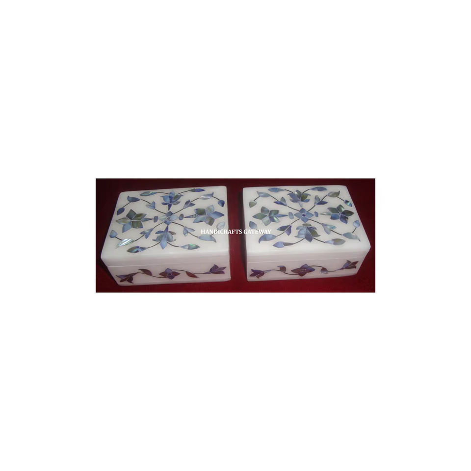 กล่องเก็บเครื่องประดับสำหรับธุรกิจกล่องของขวัญการออกแบบที่เป็นเอกลักษณ์คุณภาพสูงลายหินอ่อนสีฟ้าแม่ของไข่มุกฝังดอกไม้