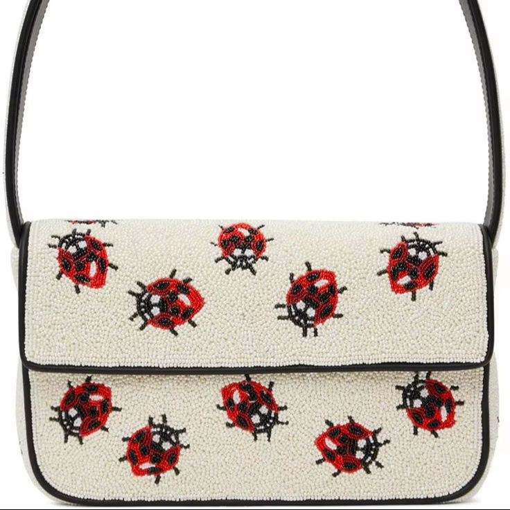 กระเป๋าถือดีไซน์โดดเด่น ลายเต่าทองสีแดงดำ ปักลายประณีต ประดับลูกปัดสีงาช้าง ปิดด้วยฝาปิด น้ำหนักเบา เป็นมิตรกับสิ่งแวดล้อม