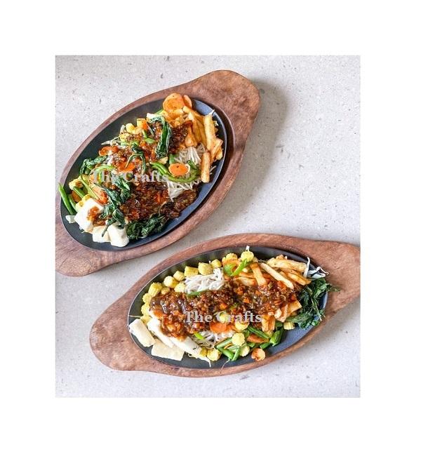 จานซิซเลอร์พร้อมฐานไม้สำหรับโต๊ะอาหารในร้านอาหารจานซิสเลอร์ออกแบบเป็นเอกลักษณ์